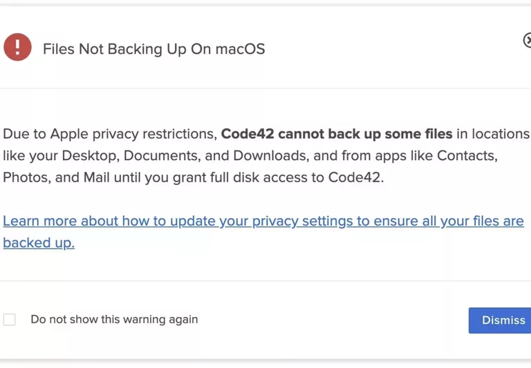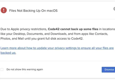 Though not strictly necessary, it is good practice to restart your computer to allow the changes you've made to take effect. The next time Code42 launches, it should have the permission it needs to access your home folder and backup your Desktop, Documents, Mail, Contacts, Photos, and more.