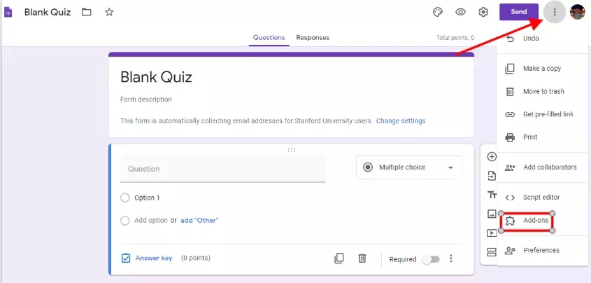 To install the add-on, while editing your form, open the three dot menu in the top right.